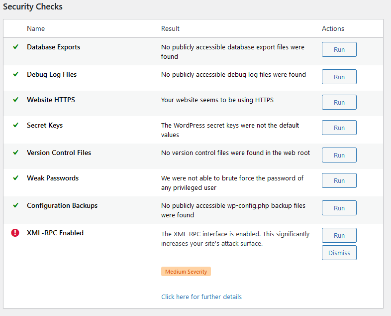 On top of this looking in the WPScan plug in it is telling me that the XML-RPC is enabled and this will significantly increase your site’s attack surface which means there are many more points of entry that the attackers can use to attempt access to the site.