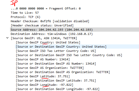 - With this set we can look at the IP layer of a packet and view the GeoIP which will include the City, Country and even map coordinates