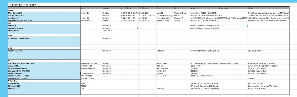 All the hardware that is being used, and some that is not, is documented in a spreadsheet. It’s crucial to keep this up to date.