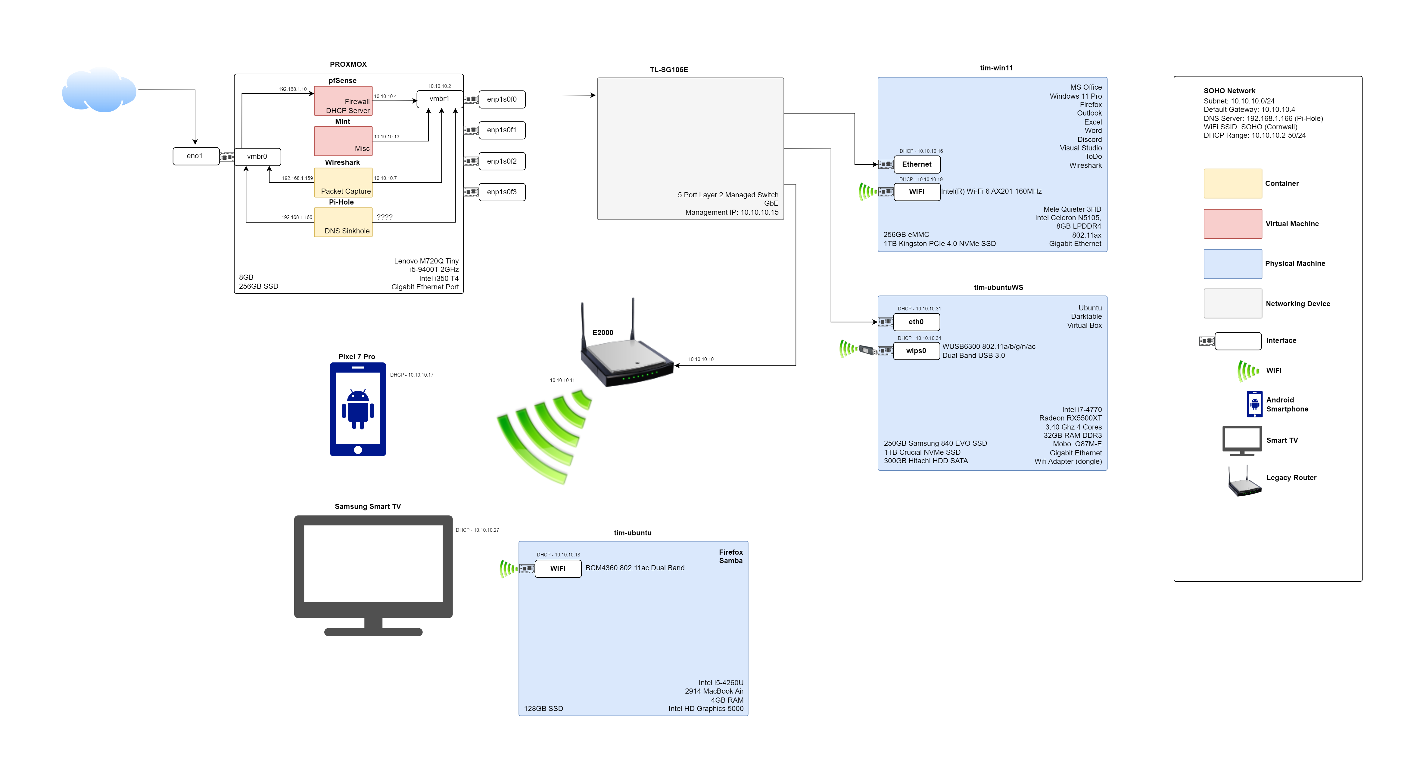 Next in line is the TL-SG105E and the rest of the devices are connected via this managed switch. Then there is tim-win11 which is my daily driver and often acts as the thin-client to tim-ubuntuWS. There is a legacy Cisco router which has been repurposed as an AP. DCHP has been disabled to avoid conflicts with IP addresses.